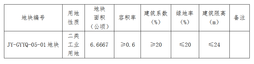 规划确定JY-GYYQ-05-01地块用地性质为二类工业用地(用地代码:100102),实际用地面积66667㎡(6.6667公顷),依据规划用地性质赋予地块相应控制性指标。