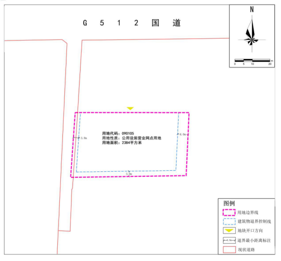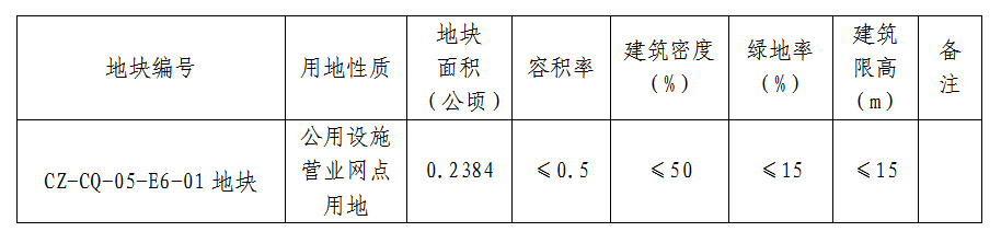 规划确定CZ-CQ-05-E6-01地块用地性质为公用设施营业网点用地(用地代码:090105),实际用地面积2384㎡(0.2384公顷),依据规划用地性质赋予地块相应控制性指标。