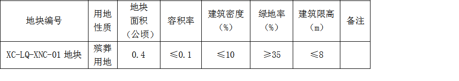 规划确定XC-LQ-XNC-01地块用地性质为殡葬用地(用地代码:1506),实际用地面积4000㎡(0.4公顷),依据规划用地性质赋予地块相应控制性指标,后附地块用地规划图、地块控制性指标一览表。